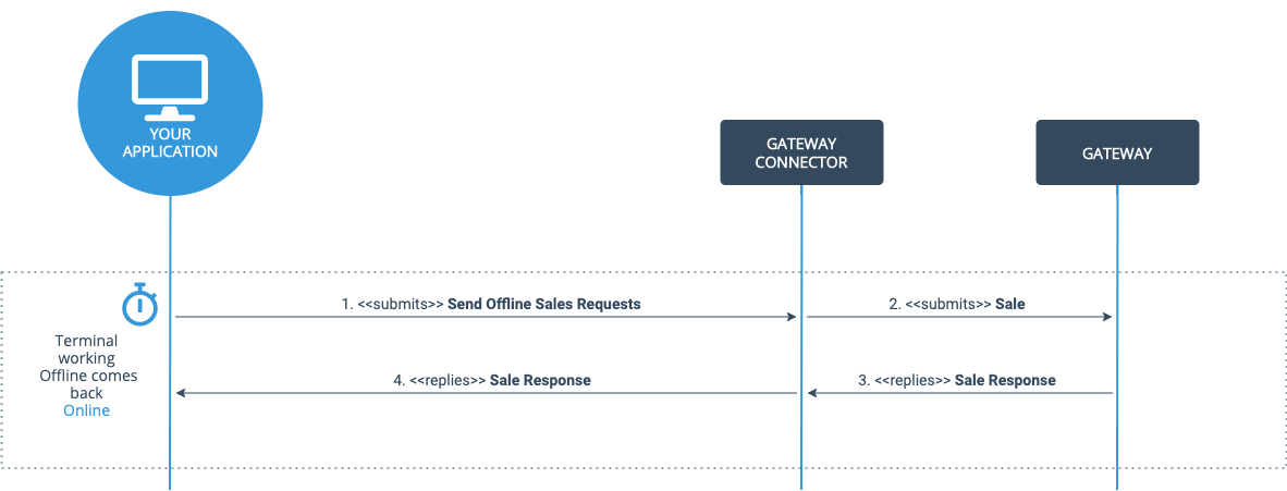 Finally, your application needs to implement (based on time or other logic) a call to the gateway to send for processing all the offline responses received while terminals were working in Offline Mode. Differently to a normal sale, the submitting of an offline sale request is going to be done by a RestConnect, not by a terminal. There's no callback result, and instead a straightforward result with the sale response. To send offline sale requests, all you need to do is retrieve the transactions stored in your application that weren’t successfully sent, and send them to the Gateway using the sendSale method available at the RestConnector class.