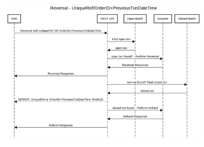 Reversals on terminals that do not force unique OrderID, now require the new field PreviousTxnDateTime when attempting Reversals using OrderID. Transactions that have been settled between the time the first transaction occurs and the time the Reversal occurs are now Refunded instead of Reversed.
